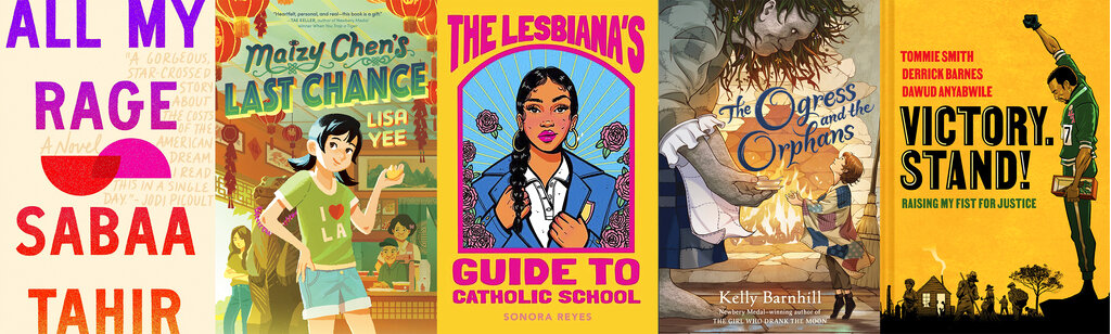 This combination of photos shows National Book Award finalists for young people’s literature, from left, "All My Rage" by Sabaa Tahir, "Maizy Chen’s Last Chance" by Lisa Yee, "The Lesbiana’s Guide to Catholic School" by Sonora Reyes, "The Ogress and the Orphans" by Kelly Barnhill and “Victory. Stand!: Raising My Fist for Justice,” a collaboration among Tommie Smith, Derrick Barnes and Dawud Anyabwile (Razorbill/Random House/Balzer + Bray/Algonquin Young Readers/Norton Young Readers via AP)