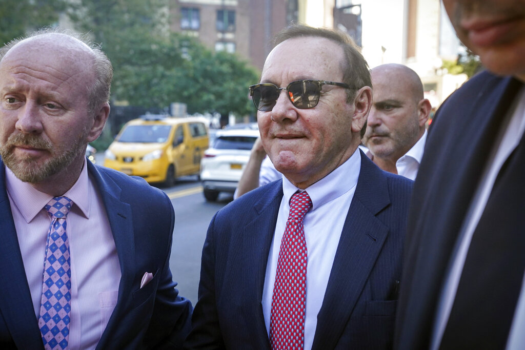 Actor Kevin Spacey leaves court following proceedings in a civil trial, Friday, Oct. 7, 2022, in New York, accusing him of sexually abusing a 14-year-old in the 1980s when he was 26. (AP Photo/Bebeto Matthews)
