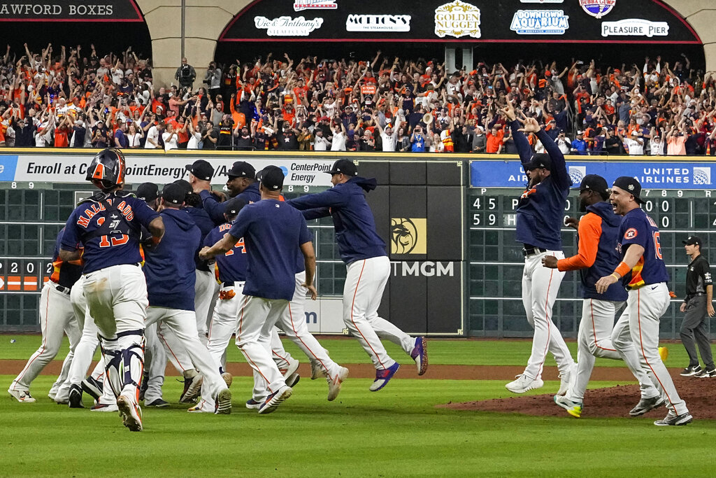 The Houston Astros celebrate their 4-1 World Series win against the Philadelphia Phillies in Game 6 on Saturday, Nov. 5, 2022, in Houston. (AP Photo/David J. Phillip)
