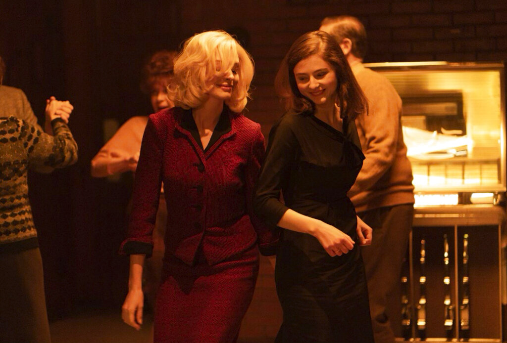 This image released by the Sundance Institute shows Anne Hathaway, left, and Thomasin McKenzie in a scene from "Eileen," which will be featured at the 2023 Sundance Film Festival. (Courtesy of Sundance Institute via AP)