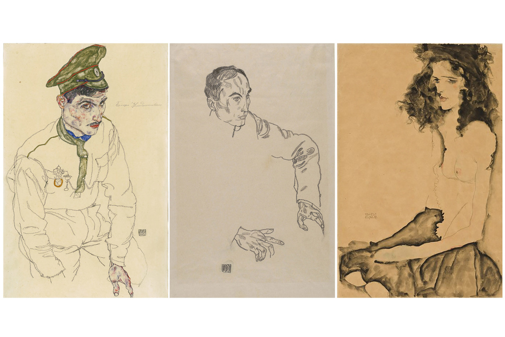 FILE _ This combo of images provided by the Manhattan District Attorney's Office, shows three artworks by Austrian expressionist Egon Schiele, from left, watercolor and pencil on paper artwork, dated 1916 and titled "Russian War Prisoner" (Art Institute of Chicago); a pencil on paper drawing, dated 1917, titled "Portrait of a Man" (Carnegie Museum of Art), and a watercolor and pencil on paper artwork, dated 1911 and titled "Girl With Black Hair" (Allen Memorial Art Museum). On Friday, Jan. 19, 2024, in New York, the estate of Holocaust victim Fritz Grünbaum accepted "Portrait of a Man,” surrendered by the Carnegie Museum of Art and "Girl with Black Hair,” surrendered by Oberlin College, which prosecutors have valued collectively at around $2.5 million. The third, “Russian War Prisoner,” remains at the Art Institute of Chicago as that museum fights the seizure in court. (Manhattan District Attorney's Office via AP, File)