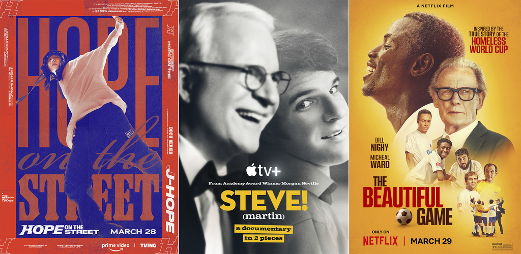 This combination of photos shows promotional art for the docuseries "Hope on the Street," about BTS member j-hope, left, the documentary "Steve! (Martin) a Documentary in 2 Pieces," and the film "The Beautiful Game." (Prime Video/Apple TV+/Netflix via AP)