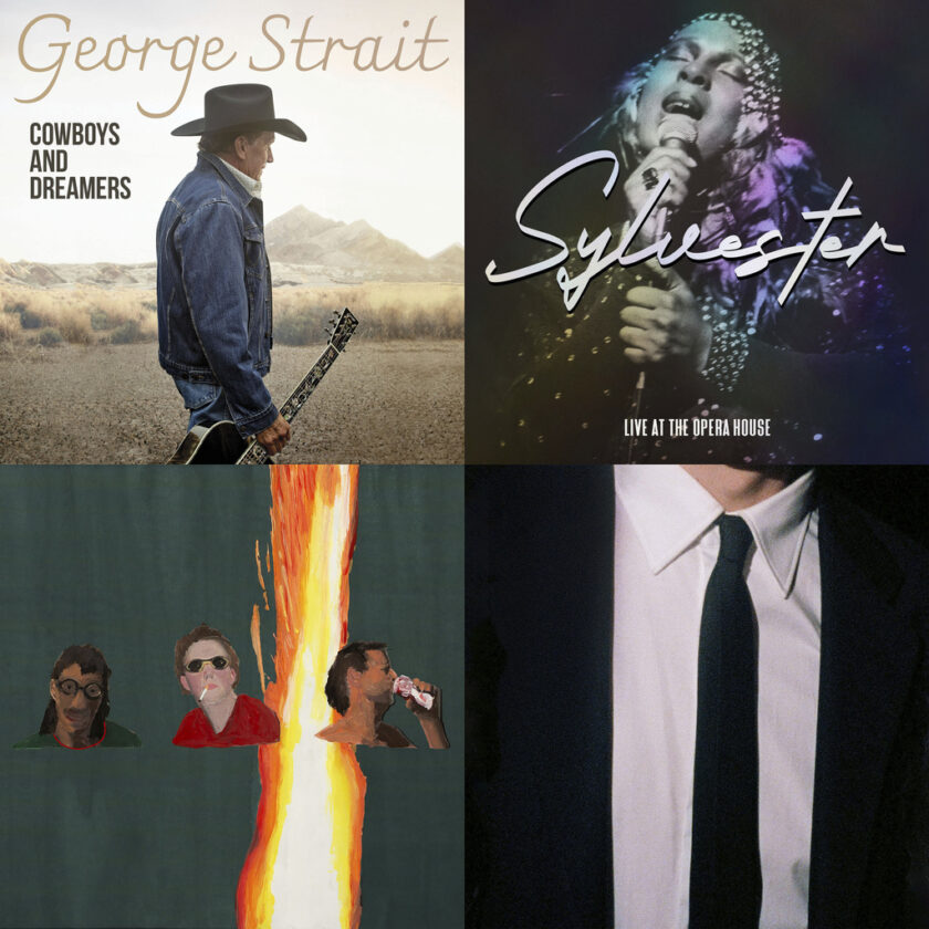 This combination of album cover images shows, clockwise from top left, "Cowboys and Dreamers" by George Strait, “Live At The Opera House” by Sylvester, “What’s Wrong With New York?” by The Dare, and "Morning Fireworks" by MJ Lenderman. (MCA Nashville/Craft Recordings-Concord/Republic Records/ANTI- via AP)