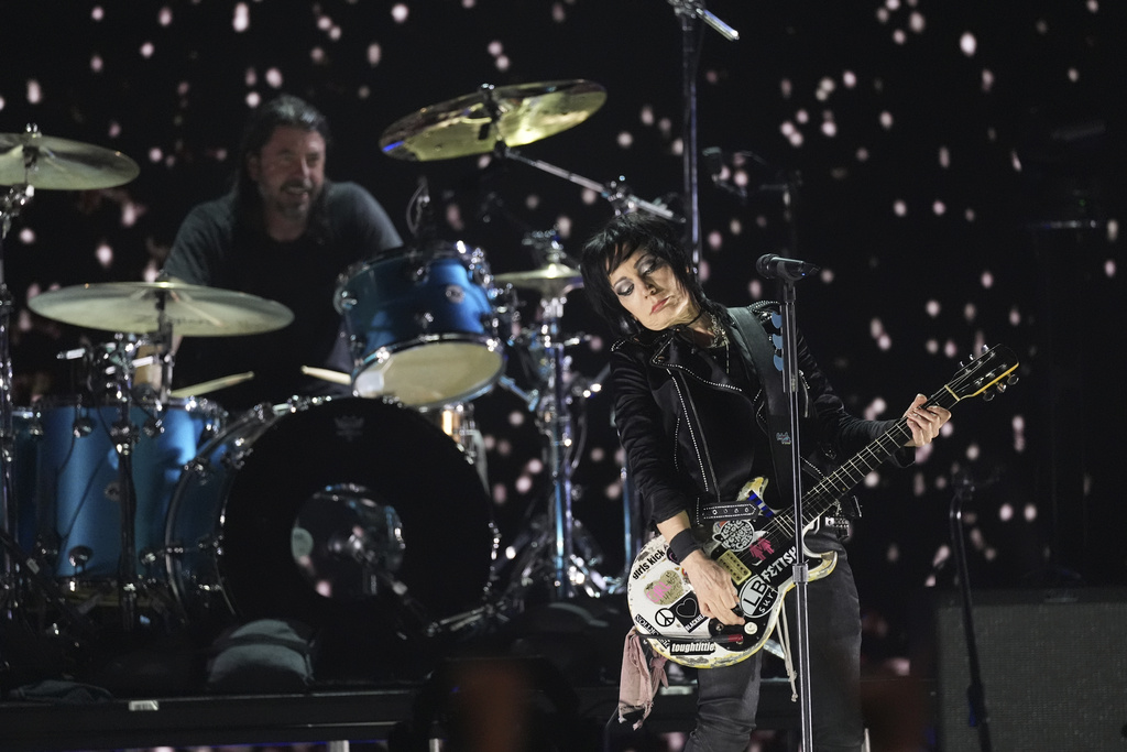 Joan Jett, right, performs with Dave Grohl of Nirvana during the FireAid benefit concert on Thursday, Jan. 30, 2025, at The Forum in Inglewood, Calif. (AP Photo/Chris Pizzello)