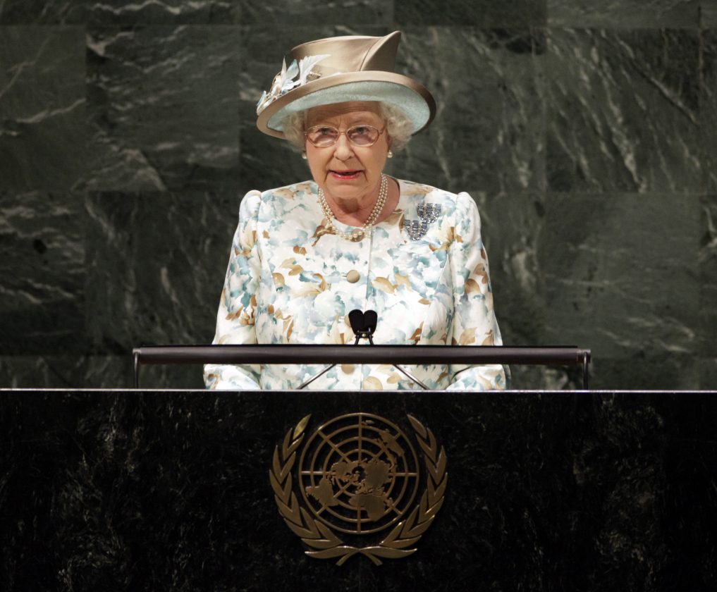 Queen Elizabeth II addresses the United Nations General Assembly, Tuesday, July 6, 2010, at United Nations headquarters. (AP Photo/Richard Drew)