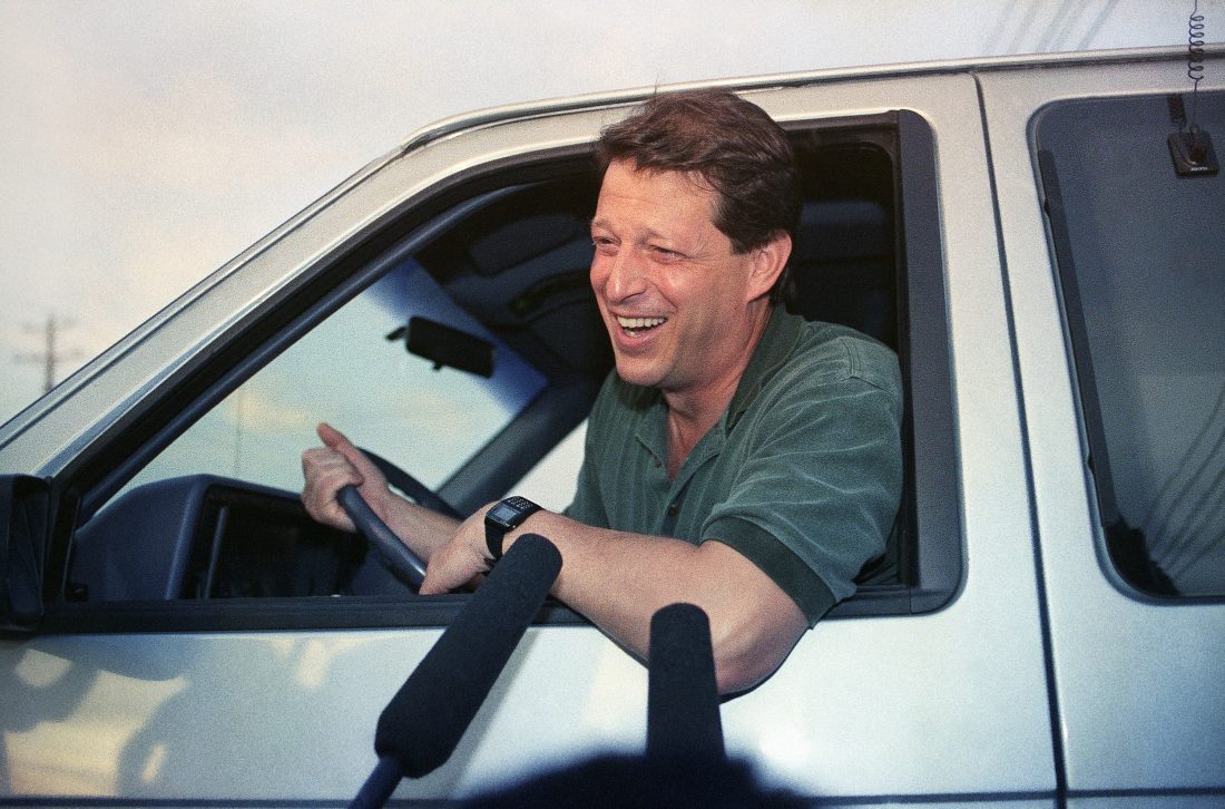 Sen. Albert Gore Jr., talks with reporters outside his Carthage, Tenn., home as he drives his family to dinner in Carthage, Wednesday, July 9, 1992. Gore repeatedly said he has no comment on the speculation that he might be the Democrats vice presidential candidate. (AP Photo/Mark Humphrey)