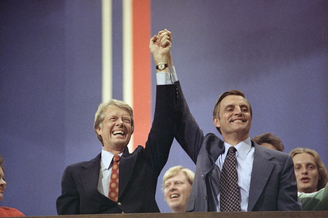 Jimmy Carter with Sen. Walter Mondale of Minn., his vice presidential choice, on the final night of the national democratic convention in Madison Square Garden in New York July 15, 1976. (AP Photo)