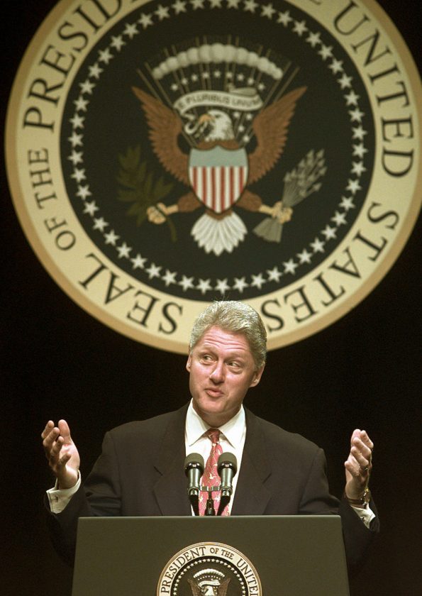 President Clinton gestures as he addresses supporters in Denver, Colo., on Monday, July 22, 1996. Clinton pledged Monday to put more pressure on deadbeat parents to pay child support. "No one should be able to escape the responsibility of bringing a child into this world," Clinton said. "Governments can do a lot of things, but they don't raise children."(AP Photo/Ed Andrieski)