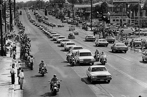 A string of white vehicles follow the hearse carrying the body of rock and roll musician Elvis Presley along Elvis Presley Boulevard on the way to Forest Hills Cemetery in Memphis, Tenn., Aug. 19, 1977. Thousands of people line the route for the city's final tribute to Elvis. (AP Photo)