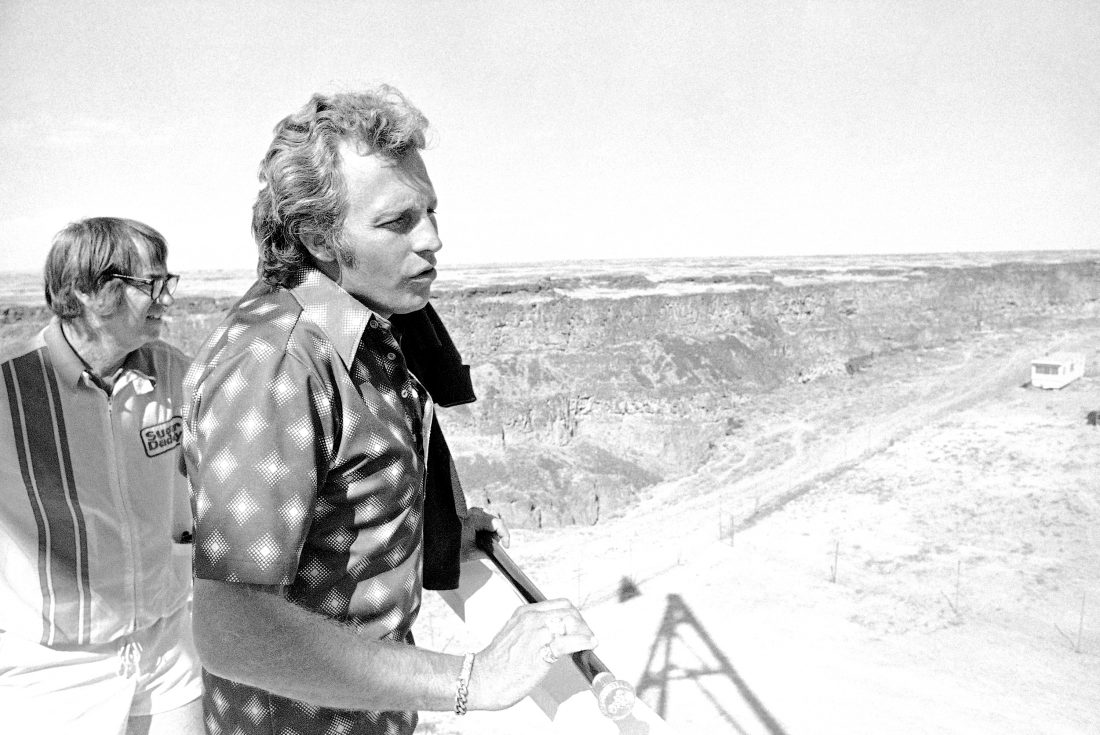 - Daredevil Evel Knievel stands beneath the steel ramp to be used next Sunday in an effort to propel him across the 1,500-foot wide Snake River Canyon near Twin Falls, Idaho, shown Sept. 4, 1974. The 500-foot deep canyon is in background. Tennis star Bobby Riggs is shown at left. (AP Photo)