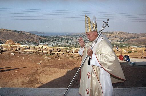 Pope John Paul II walks toward the open air altar where he will celebrate Mass in Mwanza, Tanzania, Sept. 4, 1990. In the background is the city of Mwanza and Lake Victoria. Mass was attended by 50,000 people. (AP Photo/Peter Andrews)