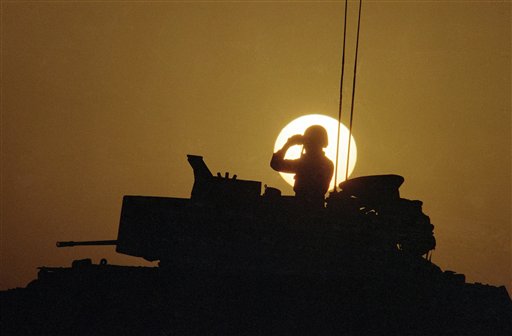A Bradley Fighting Vehicle commander from the 24th Infantry Division keeps watch as the sun sets on his base in the Saudi desert, Sunday, Oct. 10, 1990 in Saudi Arabia. The sun sets early in the desert, around d 6:00 p.m., bringing relief from the desert heat and a sky full of stars. (AP Photo/Tannen Maury)