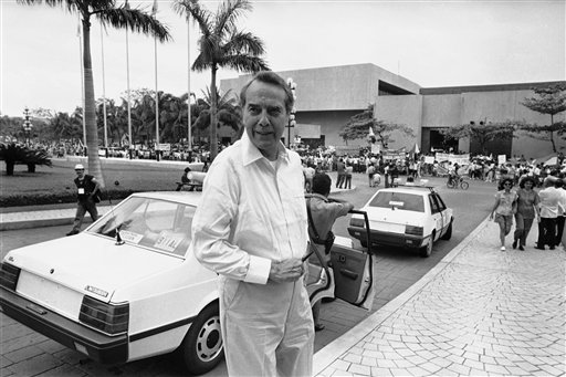 U.S. Republican Sen. Robert Dole talks briefly with reporters as he stepped out of his hotel suite, Sunday, Nov. 13, 1988 in Manila to watch some 5,000 picketing supporters of deposed President Ferdinand Marcos (background). The "Marcos loyalists" were demanding justice for their ousted leader who was recently indicted in New York on racketeering charges. (AP Photo/Bullit Marquez)