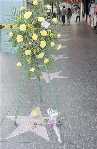 A wreath in memorial to singer-entertainer Dean Martin stands on his Hollywood Walk of Fame star Los Angeles, Dec. 27, 1995. Dean Martin died, at 78 on Christmas at his Beverly Hills, Calif., home. (AP Photo/Damian Dovarganes)