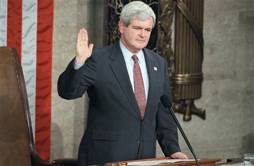 Rep. Newt Gingrich, R-Ga. is sworn in as House Speaker, Wednesday, Jan. 4, 1995 in the House chambers on Capitol Hill in Washington. Gingrich defeated Rep. Richard Gephardt, D-Mo., 228-202 to take over the leadership post in the 104th Congress which was also sworn in Wednesday. (AP Photo/Joe Marquette)
