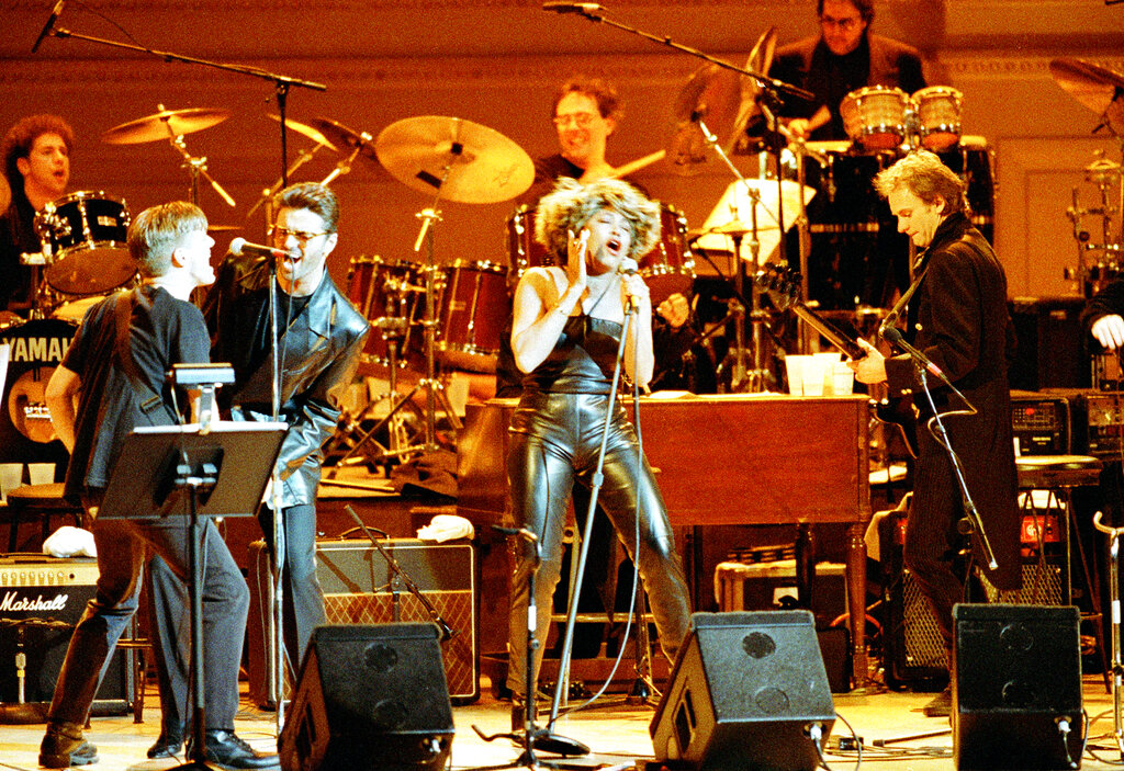 Rock and roll singer Tina Turner, center, is accompanied by musicians Brian Adams, far left, George Michael, wearing glasses, and Sting, far right on bass, during the Fourth Annual Rainforest Foundation benefit concert at New York's Carnegie Hall, Tuesday, March 2, 1993. The Rainforest Foundation, founded by Sting, is dedicated to saving the world's rainforests. (AP Photo/Ron Frehm)