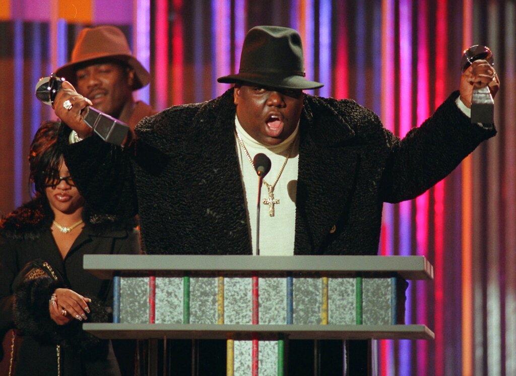 **FILE**Notorious B.I.G., who won rap artist and rap single of the year, clutches his awards at the podium during the Billboard Music Awards in New York, on evening, Dec. 6, 1995. Lawyers for the city of Los Angeles in papers filed in federal court, Tuesday, June 6, 2006, accused the family of the slain rapper of going to "odious" and "absurd" lengths -- including lying -- to "satisfy their ambition to extract hundreds of millions of dollars" from the city. The family alleges that the city had withheld documents and covered up police misconduct while defending a wrongful death lawsuit. The rapper, whose real name was Christopher Wallace, was shot and killed March 9, 1997, after a party at the Petersen Automotive Museum in Los Angeles.(AP Photo/Mark Lennihan)