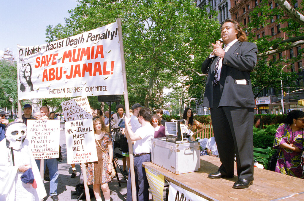 The Rev. Al Sharpton speaks as followers of Mumia Abu-Jamal, a Pennsylvania death row inmate, look on during an anti-death penalty rally in New York's City Hall Park, June 4, 1995. Hundreds of protestors gathered against New York State's new death penalty law. (AP Photo/Clark Jones)