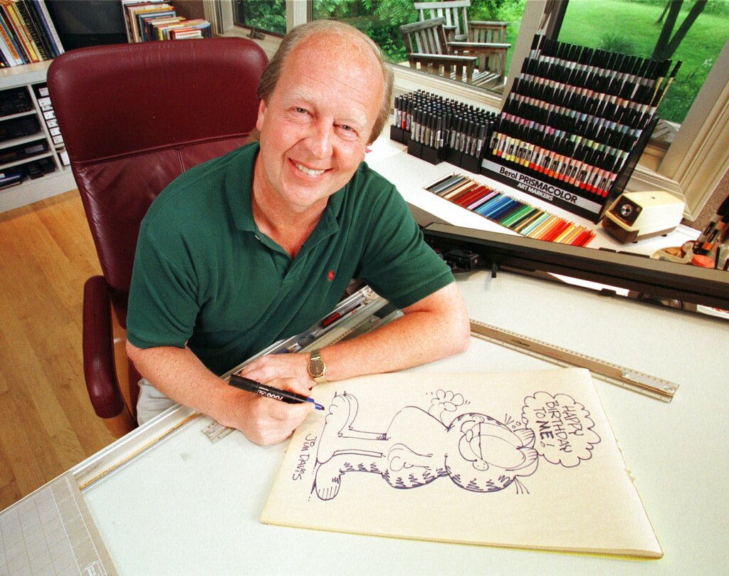 Garfield creator Jim Davis, pauses after drawing the cartoon character in his Muncie, Ind., office Tuesday, June 9, 1998. Davis created the wacky cat 20 years ago and has seen the cat grow into a commercial success with a worldwide-syndicated strip, 13 prime-time animated television shows and at least 40 books. Garfield's birthday will be commorated June 19 to Aug. 30, with an exhibit at the International Museum of Cartoon Art in Boca Raton, Fla. (AP Photo/Michael Conroy)