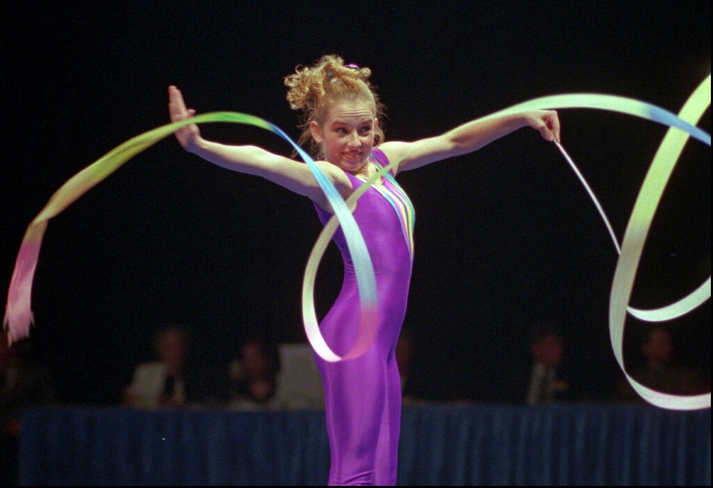 Rhythmic gymnast Tina Tharpe, of Jacksonville, Fla., performs with ribbon during the 1996 Rhythmic Gymnastic Olympic Team Trials in Boston, Wednesday, June 26, 1996. Tharpe placed third with an all-round score of 71.875 behind Natalie Lacuesta who did not compete due to an injury. (AP Photo/Chitose Suzuki)