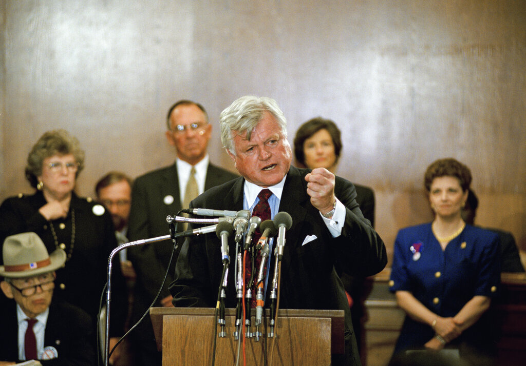 Sen. Edward Kennedy, D-Massachusetts, gestures while speaking about health care reform Thursday, August 11, 1994 on Capitol Hill in Washington. The Senate continued debate Thursday on a health care reform proposal submitted by Senate Majority Leader George Mitchell, of Maine. (AP Photo/Charles Tasnadi)