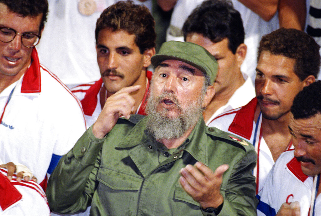 Cuban athletes surround Cuban leader Fide Castro to sing Happy Birthday in recognition of Castros 65th birthday in Havana on August 13, 1991. Castro attended the USA/Cuba water polo finals at the Pan Am games. Cuba won 8-5. (AP Photo/Charles Tasnadi)