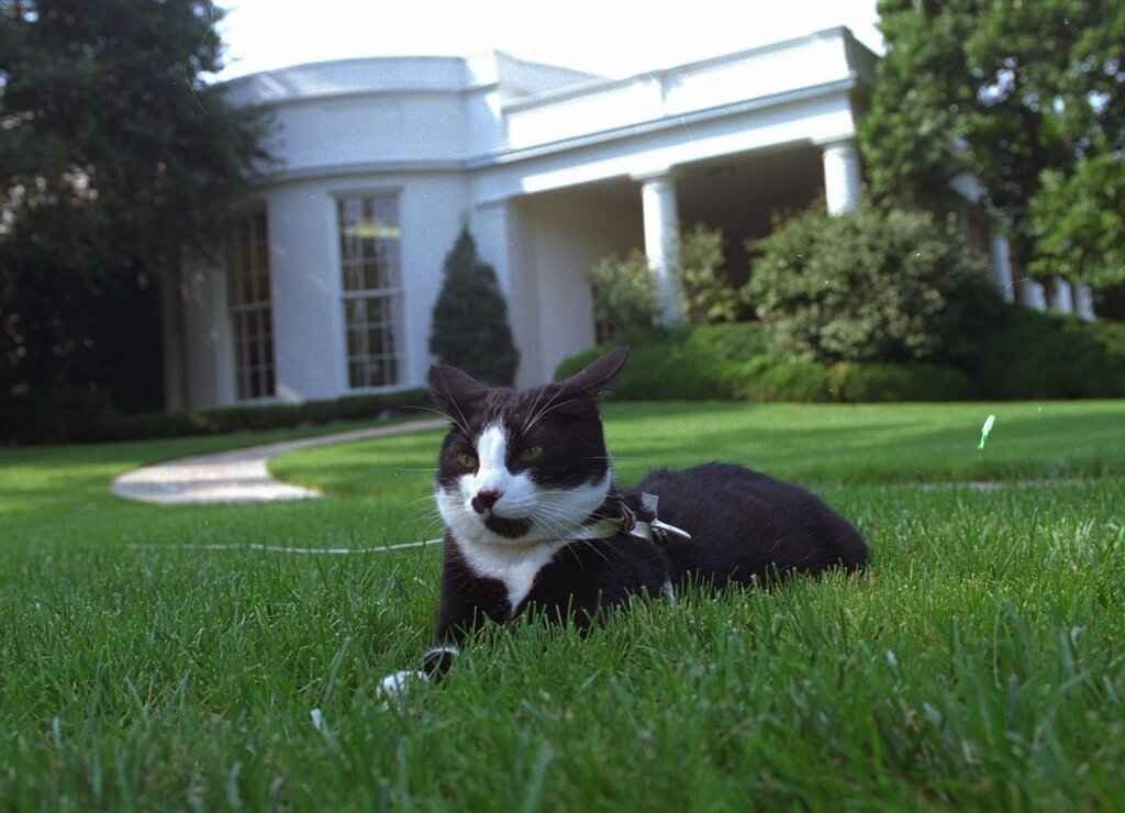 First cat Socks rests in the grass outside the Oval Office of the White House Friday Aug. 26, 1994. President Clinton and family are expected to leave the White House Friday for Martha's Vineyard off the Massachusetts coast for a vacation with Socks staying behind. (AP Photo/Marcy Nighswander)