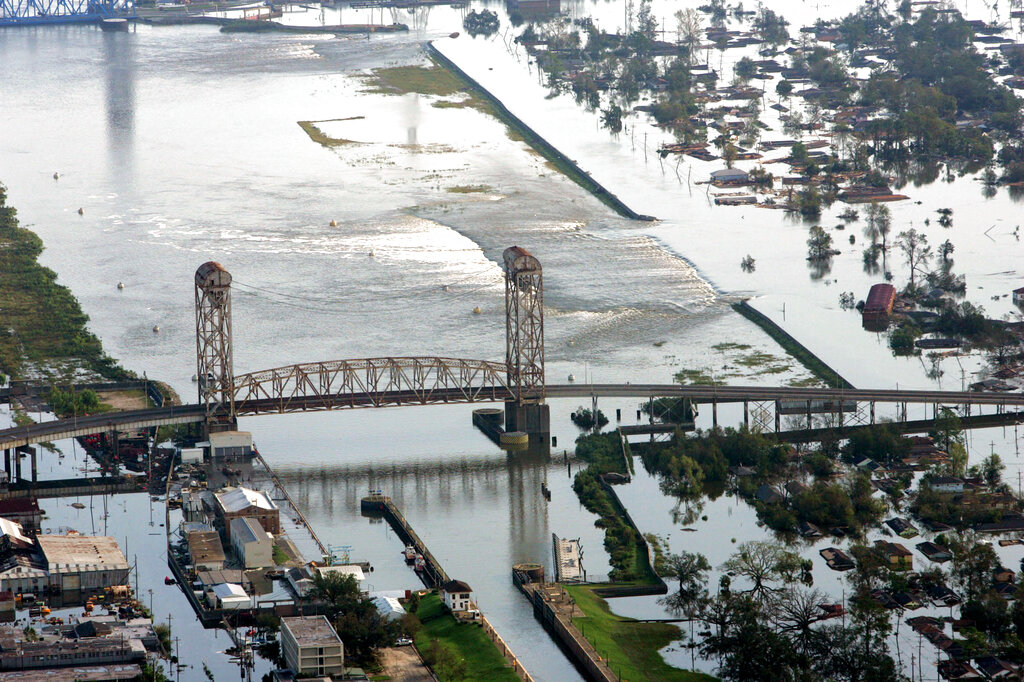 Floodwaters from Hurricane Katrina flow over a levee along Inner Harbor Navigaional Canal near downtown New Orleans Tuesday, Aug. 30, 2005. Hurricane Katrina did extensive damage when it made landfall on Monday. (AP Photo/David J. Phillip)