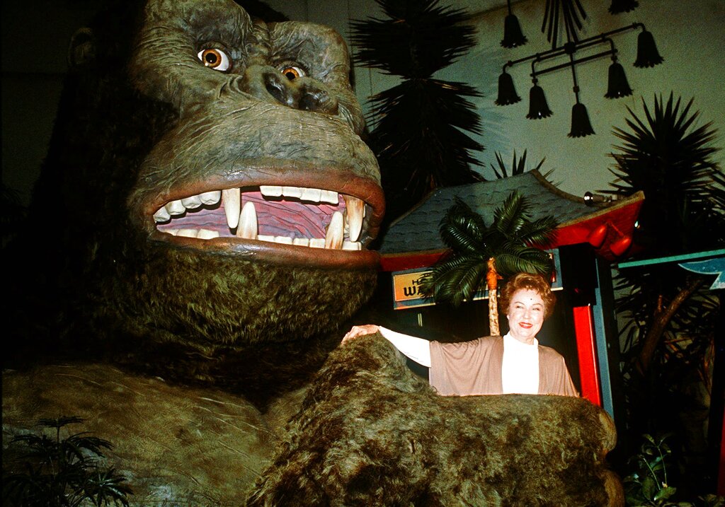 Fay Wray, star of the 1933 film, "King Kong," poses in the hand of a latter-day Kong during a publicity appearance at Mann's Chinese Theatre in Los Angeles in this May, 1983, file photo. Speaking in Los Angeles Saturday, Aug. 31, 1996, of the Chicago-area gorilla that saved a toddler who fell into her cage, Wray said, "I thought that was thrilling." She joked that it restored the reputation that gorillas have lost "ever since Kong took me to the top of the Empire State Building." (AP Photo)