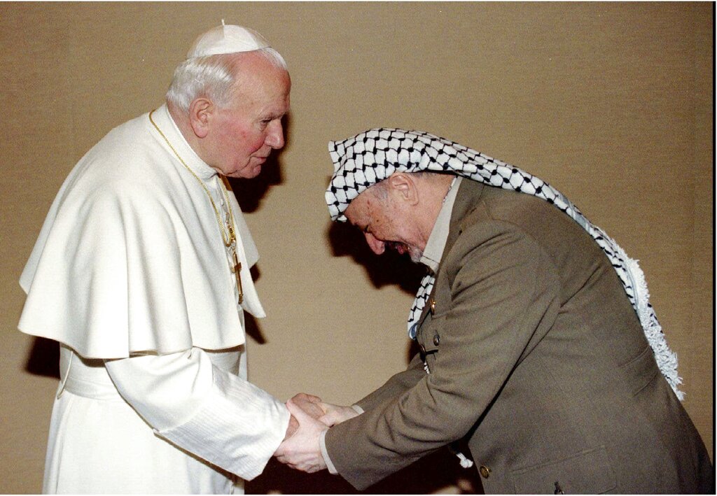 Pope John Paul II, left, greets PLO leader Yasser Arafat at his summer residence in Castelgandolfo Saturday September 2 1995. Arafat is in Italy for talks with Italian leaders and the Israeli Foreign Minister Shimon Peres. (AP Photo/ Luciano Mellace, pool)