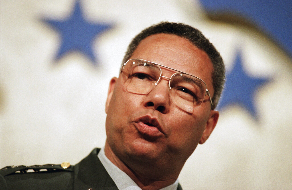 Chairman of the Joint Chiefs of Staff Colin Powell speaks at a one-day international conference on Europe, Sept. 7, 1992 in London. Powell said that military intervention cannot bring peace to the former Yugoslav republics, and might make the situation worse. Western nations have agreed to increase the number of troops assigned to U.N. duty in Bosnia-Herzegovina, to protect relief supplies. (AP Photo/Martin Cleaver)