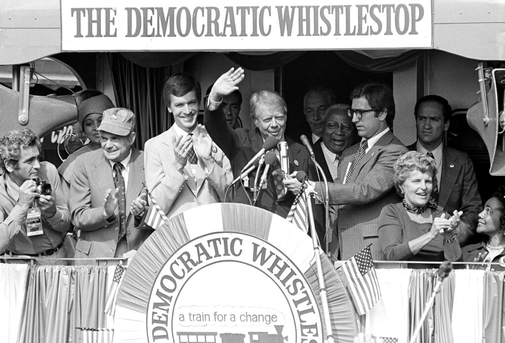 Pennsylvania Gov. Milton Shapp, left center, applauds as presidential candidate Jimmy Carter, waves during a campaign stop, Sept.10, 1976, Philadelphia, Pa. Carter was joined by Shapp aboard the train during the whistle stop campaign. The rest of the group is unidentified. (AP Photo/Rusty Kennedy)
