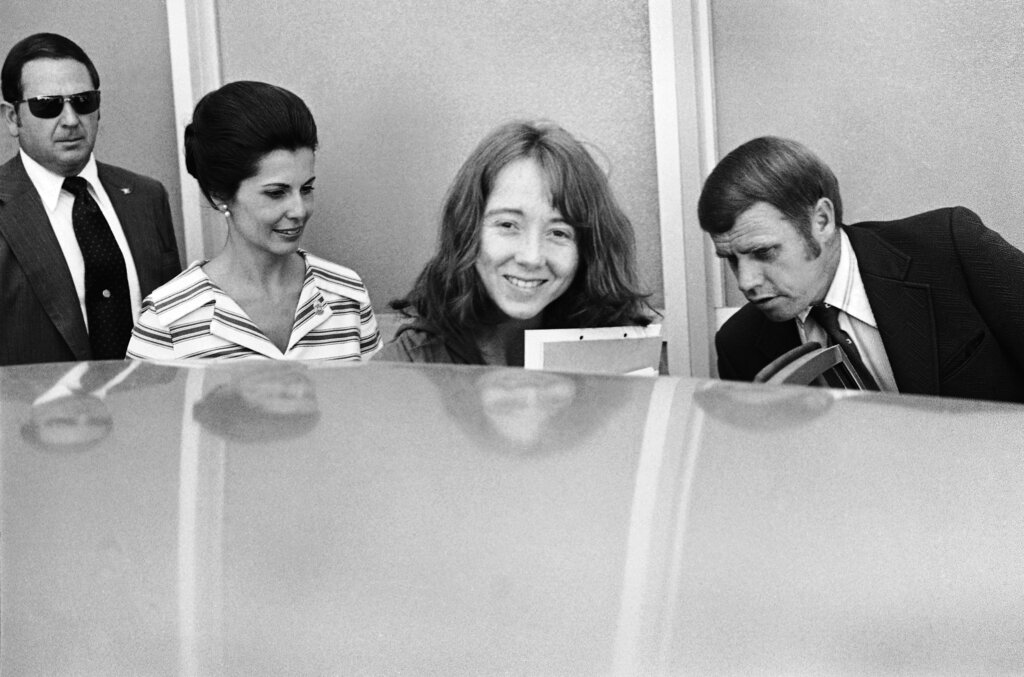 Lynette "Squeaky" Fromme, who is being held in Sacramento for attempting to assassinate President Ford, smiles at photographers outside the Federal Court in Sacramento, Calif., Sept. 16, 1975, as she was being taken back to jail. Ms. Fromme attended a court hearing where her bail was reduced from $1 million to $350,000. (AP Photo/Walt Zeboski)