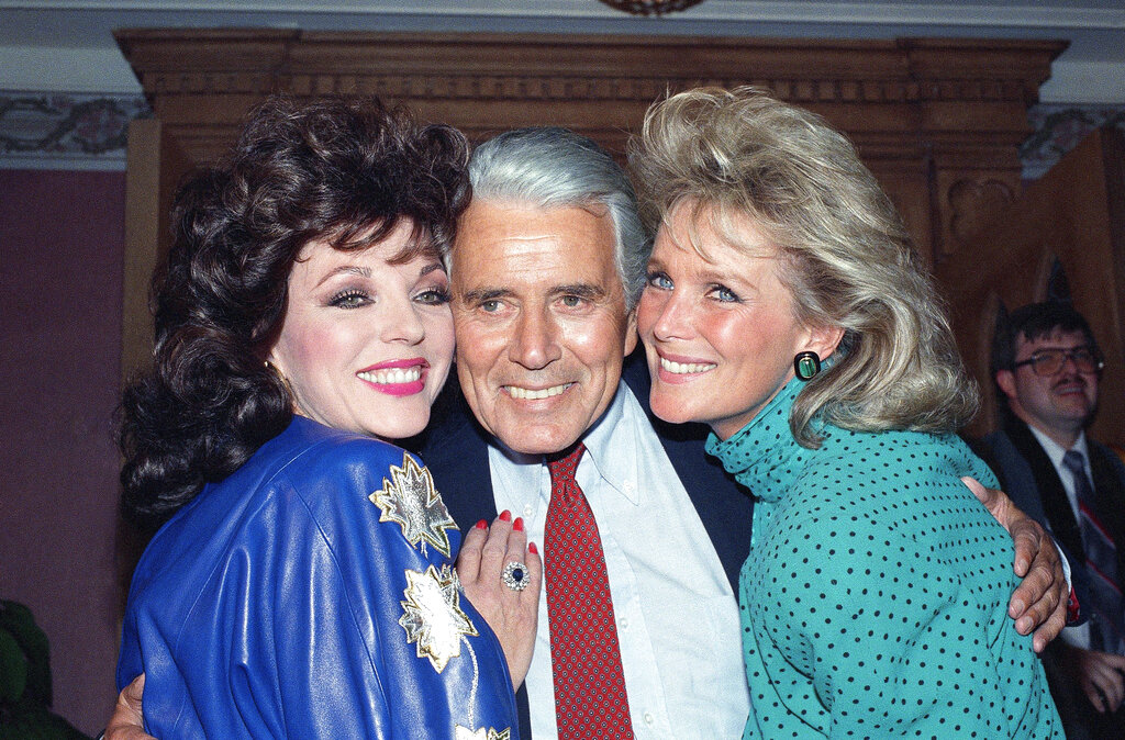 Actor John Forsythe is joined by "Dynasty" actresses Joan Collins, left, and Linda Evans, at a party celebrating the production of 150 episodes of the popular series, Sept. 24, 1986 in Los Angeles. (AP Photo/Reed Saxon)