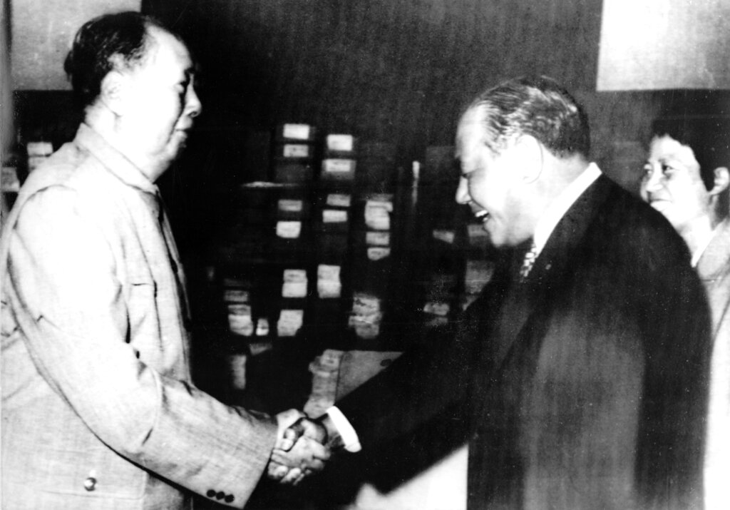 Tanaka visits Mao. Japanese Prime Minister Kakuei Tanaka is welcomed by Chinese Communist Party Chairman Mao Tse Tung during his official visit to the People's Republic of China on Thursday, Sept. 28, 1972, in Beijing. Tanaka is the first Japanese Premier to visit China since the Chinese Revolution. (AP Photo) --- Tanaka bei Mao. Der japanische Ministerpraesident Kakuei Tanaka, rechts, der sich seit einigen Tagen zu einem offiziellen Staatsbesuch in der chinesischen Volksrepublik aufhaelt, wurde am Donnerstag, 28. Sept. 1972, in Peking vom Parteivorsitzenden Mao Tse Tung, links, zu einem Gespraech empfangen und hier mit Handschlag begruesst. Tanaka ist der erste japanische Premier, der China seit der Chinesischen Revolution besucht. (AP Photo)