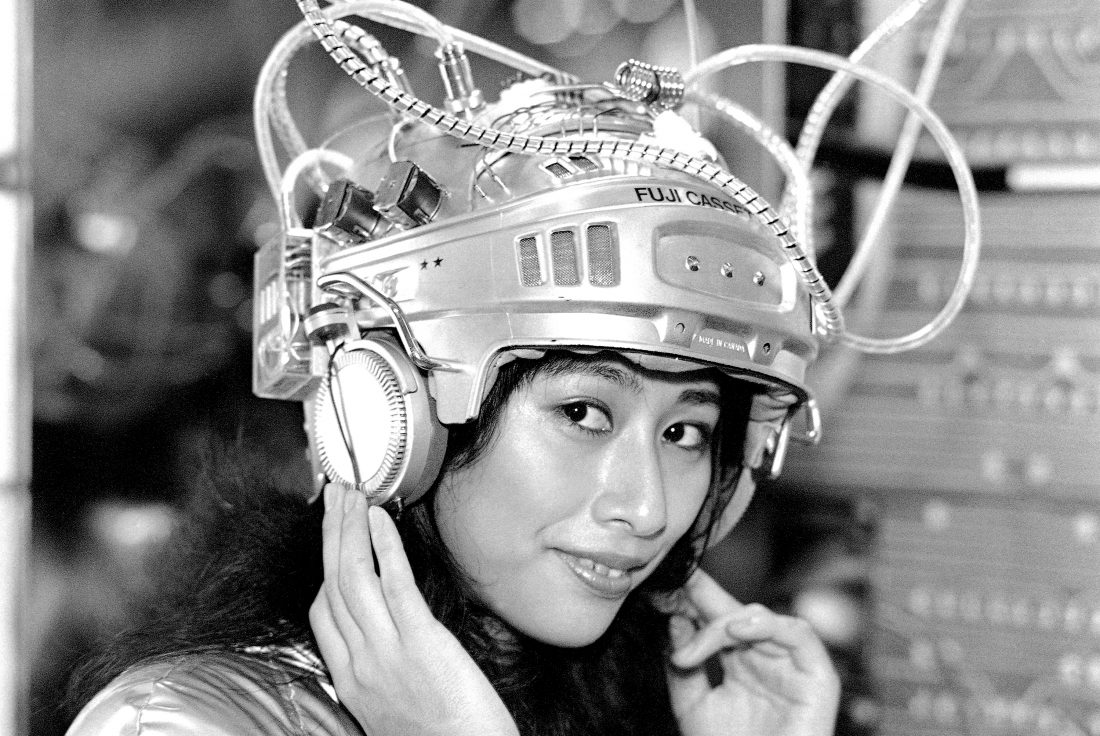 - Young lady models a helmet for listening to stereo sound. But it’s mainly a publicity ploy, and the wires, coils and other impressive paraphernalia are just in fun. It was part of the display at the Japan Electronics Show in Tokyo, Japan on Oct. 15, 1980. (AP Photo/Neal Ulevich)