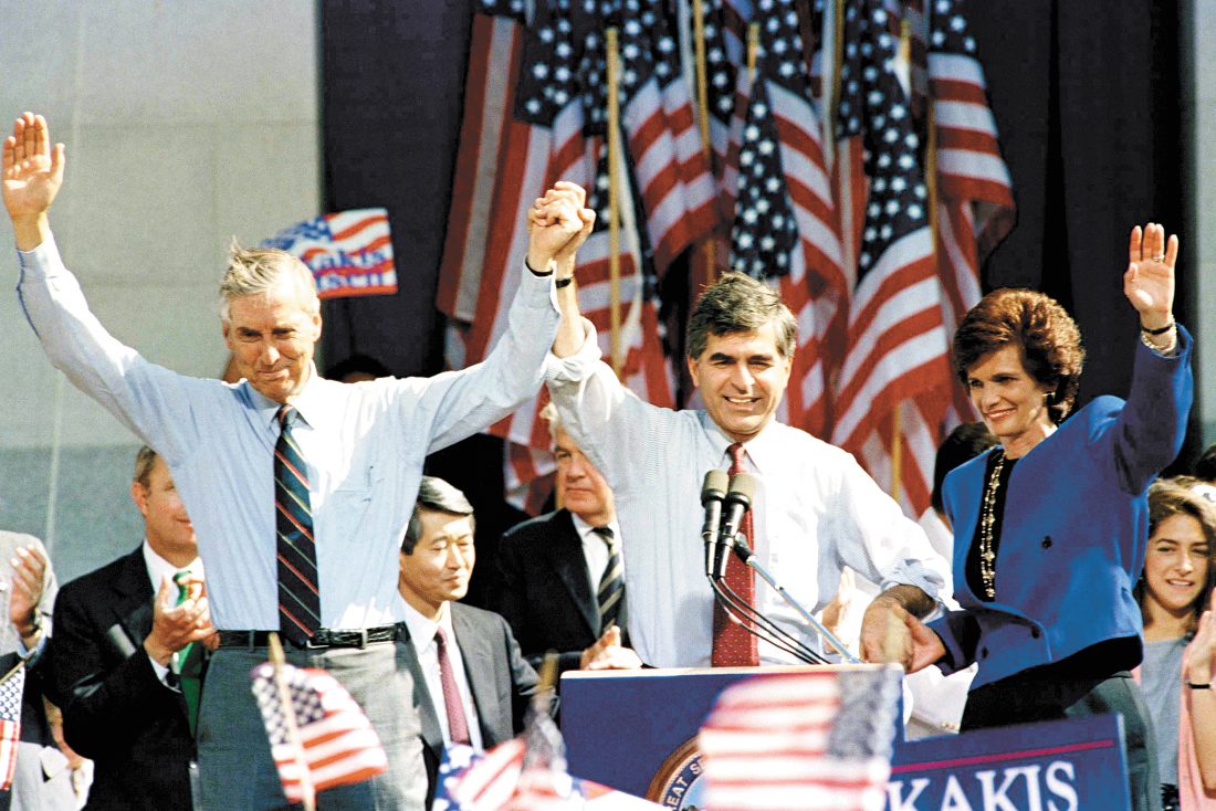- Democratic presidential candidate Michael Dukakis, along with his wife Kitty and running mate Lloyd Bentson, raise their arms in jubilation on Friday, Oct. 14, 1988 following a rally at the state Capitol building in Sacramento, Calif., where Dukakis resumed his campaign following Thursday night?s debate with Vice President George H.W, Bush. (AP Photo/Rich Pedroncelli)