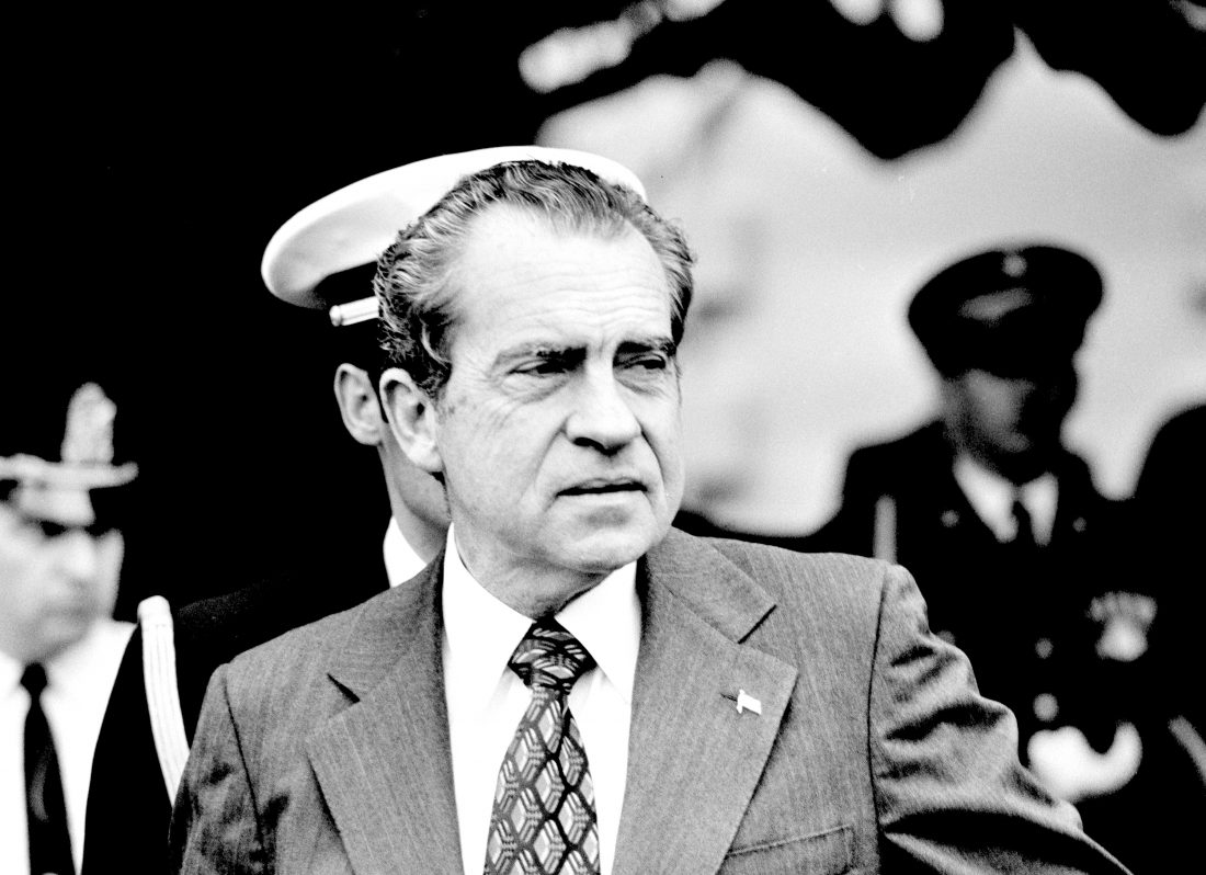 U.S. President Richard M. Nixon is seen outside the White House in Washington, D.C., Thursday, Oct. 11, 1973, as he says goodbye to Ivory Coast President Felix Houphouet-Boigny after a state visit. The White House said that President Nixon hopes to begin assessing a possible successor to Spiro T. Agnew at the end of the day after receiving suggestions from Congress and Republican party leaders. The vice president resigned yesterday after charges of income tax evasion. (AP Photo)