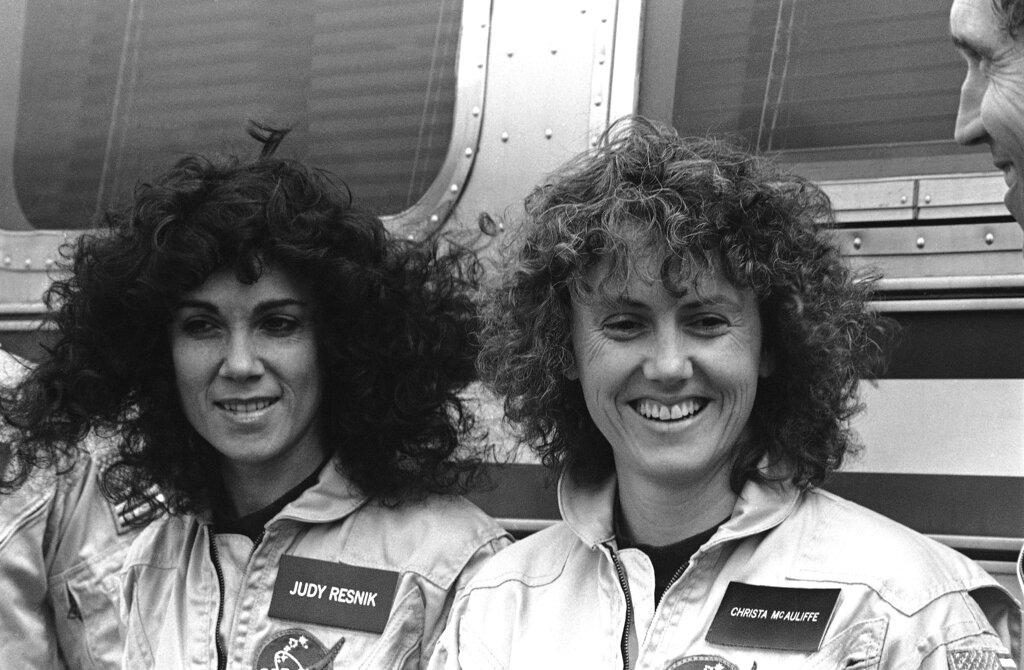 Teacher Christa McAuliffe of Concord, New Hampshire, right, and mission specialist Judith Resnik talk with reporters at Kennedy Space Center, Fla., Jan. 9, 1986, after a dry countdown test in preparation for the January 23 launch of Space Shuttle Mission 51-L. McAuliffe is America's first teacher-astronaut. (AP Photo)