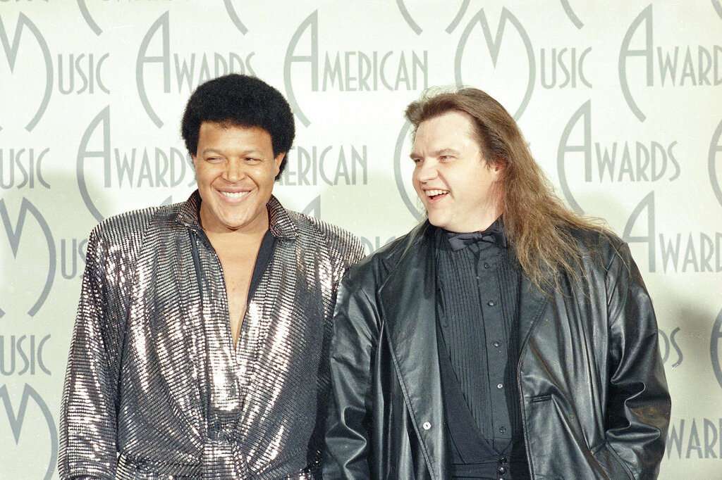 Rock stars Chubby Checker, left, and Meat Loaf are seen together at the American Music Awards in Los Angeles, Jan. 26, 1987. (AP Photo/Lennox McLendon)
