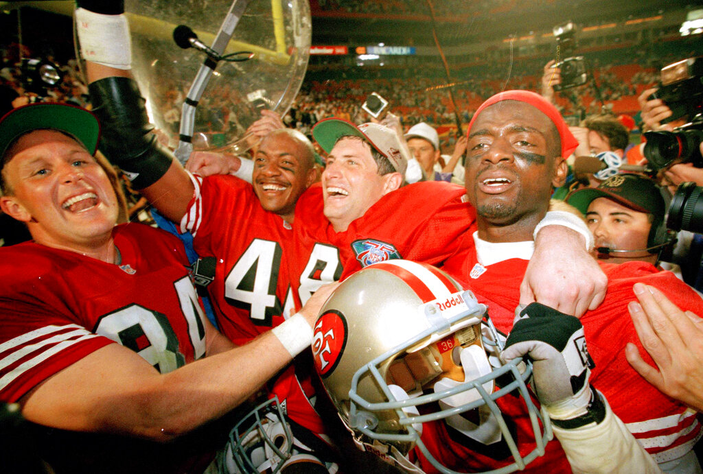 San Francisco 49ers, from left, Brent Jones, William Floyd, Steve Young and Merton Hanks, celebrate after Super Bowl XXIX, Jan. 29, 1995 at Miami's Joe Robbie Stadium, after defeating the San Diego Chargers. Young was named Most Valuable Player. (AP Photo/Susan Walsh)