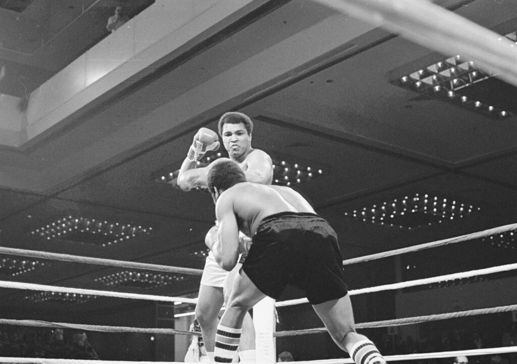 Heavyweight champ Muhammad Ali prepares his right as he jabs at challenger Leon Spinks with his left during the first round at their 15-round title bout at the Hilton Pavillion in Las Vegas, Nev., Feb. 16, 1978. (AP Photo)