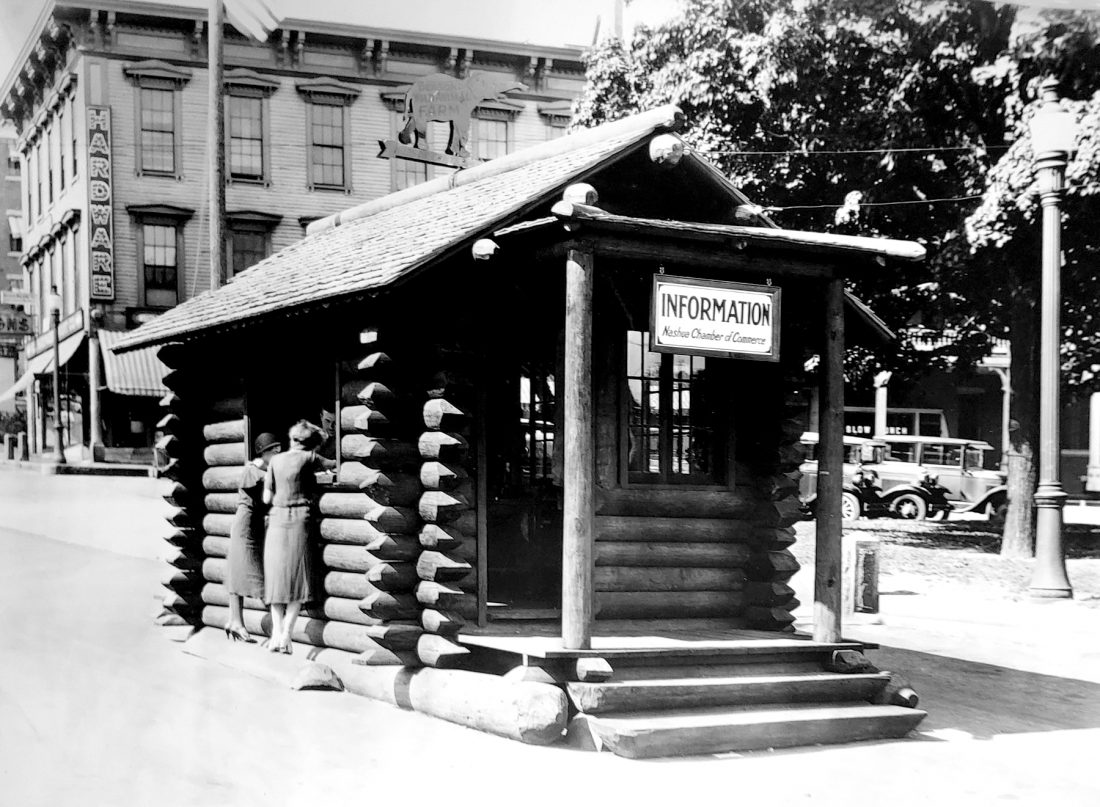 Main Street at Railroad Square looked a little different in the late 1930s than it does today, and the same goes for the Deschenes Oval, a small portion of which is visible at right. This scale version of a log cabin was one of two or three incarnations of the then-Nashua Chamber of Commerce information booth, then a common sight in or near many cities’ downtowns when ‘superhighways,’ turnpikes or interstates were still 15-20 years in the future. Now, of course, much larger information centers, usually located at interstate rest areas, have replaced the quaint downtown information booths. In the background at left is an early version of Hammar Hardware’s vertical sign on the corner of the Laton block. Whatever became of this log-cabin info center isn’t known, but hopefully it wasn’t just taken away and demolished.