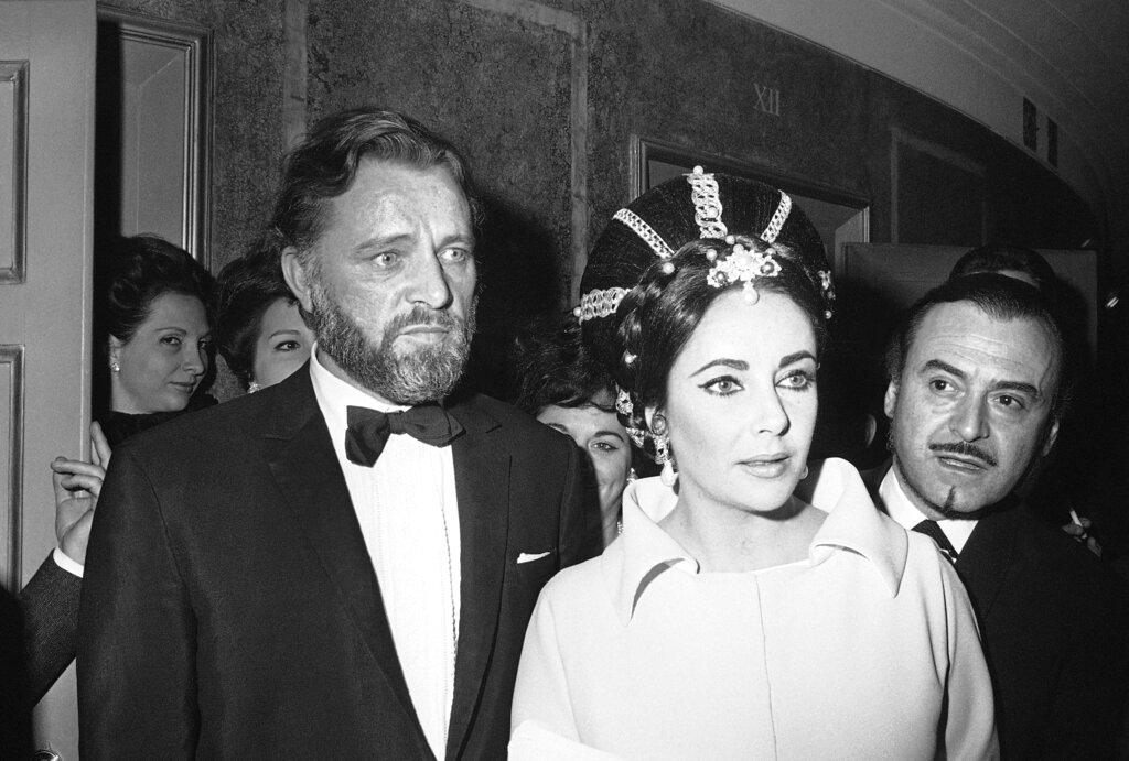 British actress Elizabeth Taylor and her husband, British actor Richard Burton, arrive on March 24, 1966 at Romes Opera House to attend a gala ballet performance starring Russian dancer Rudolph Nureyev, Danish dancer Erik Bruhn, and Italian dancer Carla Fracci. Liz Taylor displays a special Renaissance hairdo which has been created for her role in the forthcoming film on Shakespeares The Taming of the Shrew, which is presently being shot in Rome with the couple in the starring parts. (AP Photo/Gianni Foggia)