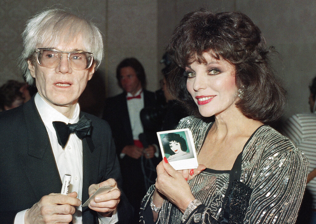 Actress Joan Collins chats with Andy Warhol, April 1, 1985. She holds a snapshot of a portrait Warhol painted of her. (AP Photo/Liu Heung Shing)