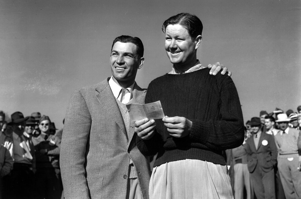 Ben Hogan, left, and Byron Nelson are tied with a score of 280 at the conclusion of the 72-hole Masters Golf Tournament in Augusta, Ga., on April 12, 1942. The two Texans will compete for the title in the 18-hole match on April 13 at the Augusta National Golf Club. Hogan made up a three stroke deficit in the final round to tie Nelson, who led at the three quarter mark. (AP Photo)
