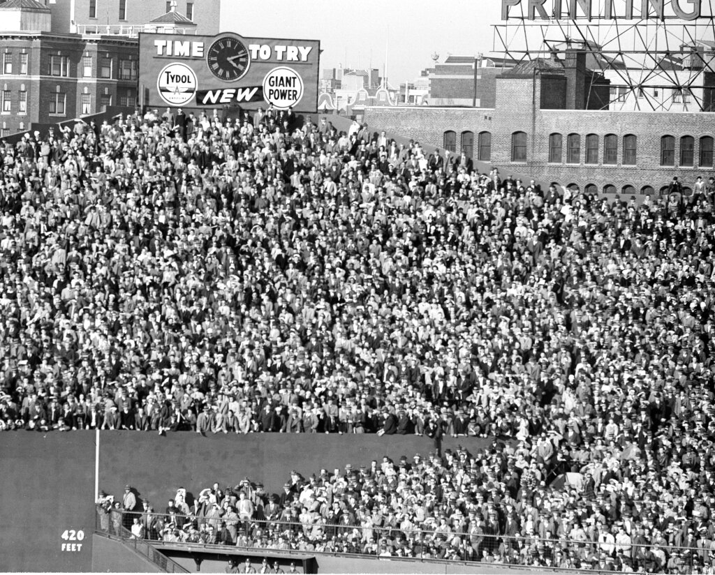 This view shows part of the record 33,279 fans at the end of the Boston Red Sox and Boston Braves intra-city series in Fenway Park in Boston, Ma., April 14, 1946. The Red Sox beat the Braves, 19-5. (AP Photo)
