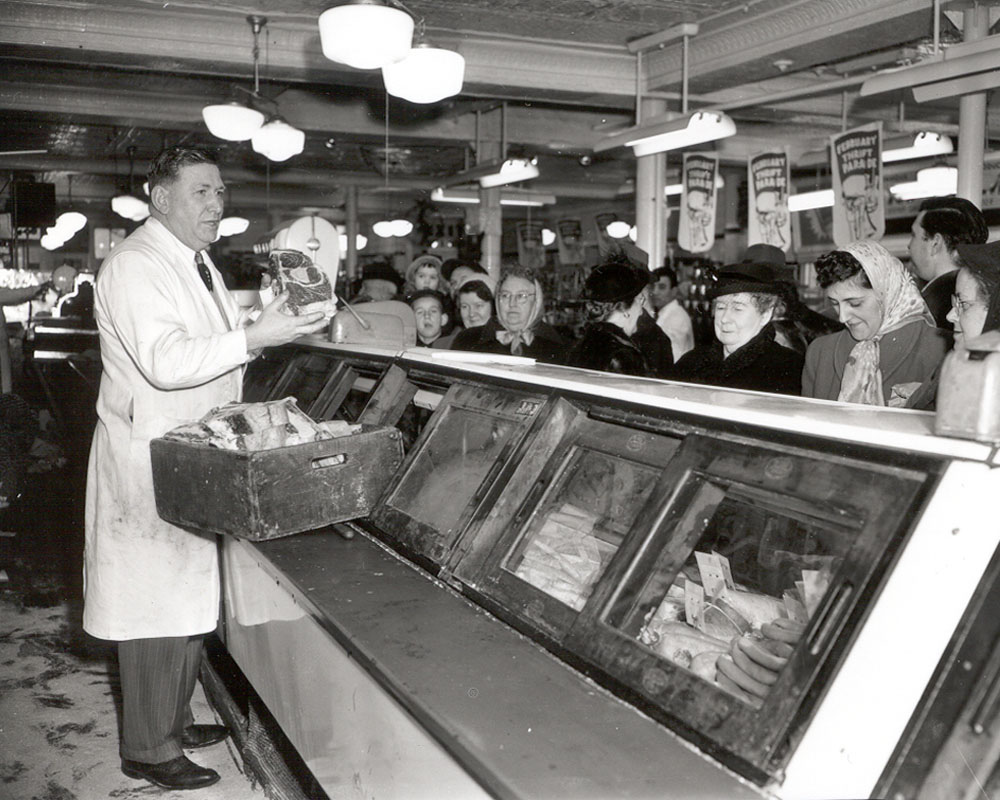 Most of these ladies lined up at the meat counter in the former Brockleman’s grocery store a few decades ago seem only mildly interested in what he has to say about the roast that may have been on sale that day. Unfortunately we don’t know the name of the butcher, but someone may recognize him – or maybe one or more of the women at the counter.
