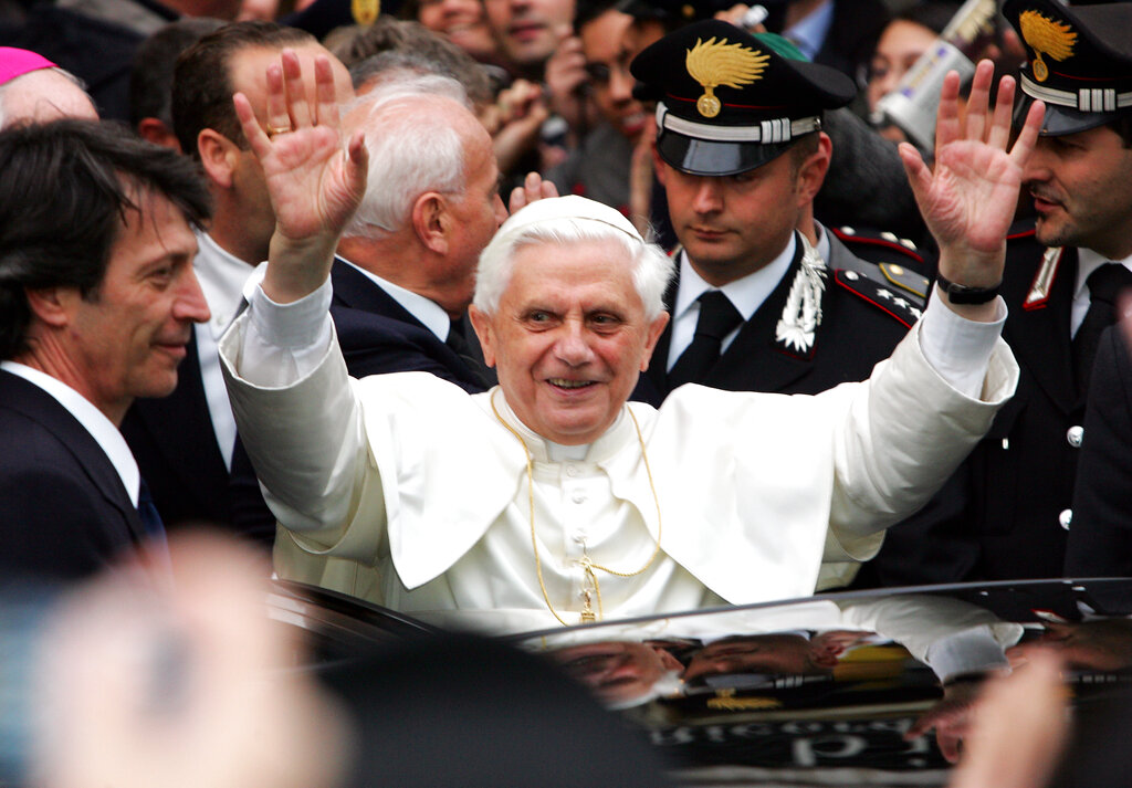 Pope Benedict XVI greets the crowd gathered in front of his former private home in Rome, Wednesday, April 20, 2005. The Pontiff, former Cardinal Joseph Ratzinger of Germany, exited the Vatican City Wednesday for a quick visit to his former home in Rome. (AP Photo/Andrew Medichini)
