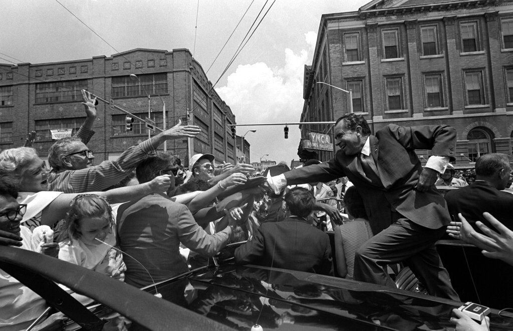 U.S. President Richard Nixon stands on the bumper of his car as he reaches to shake hands in downtown Mobile, Ala., on May 25, 1971. Nixon was in Alabama to mark the start of the construction on the Tennessee-Tombigbee Waterway. (AP Photo/Chick Harrity)
